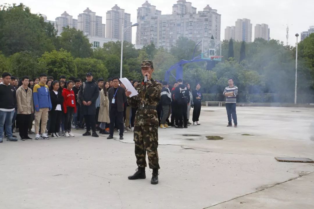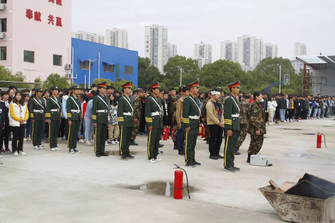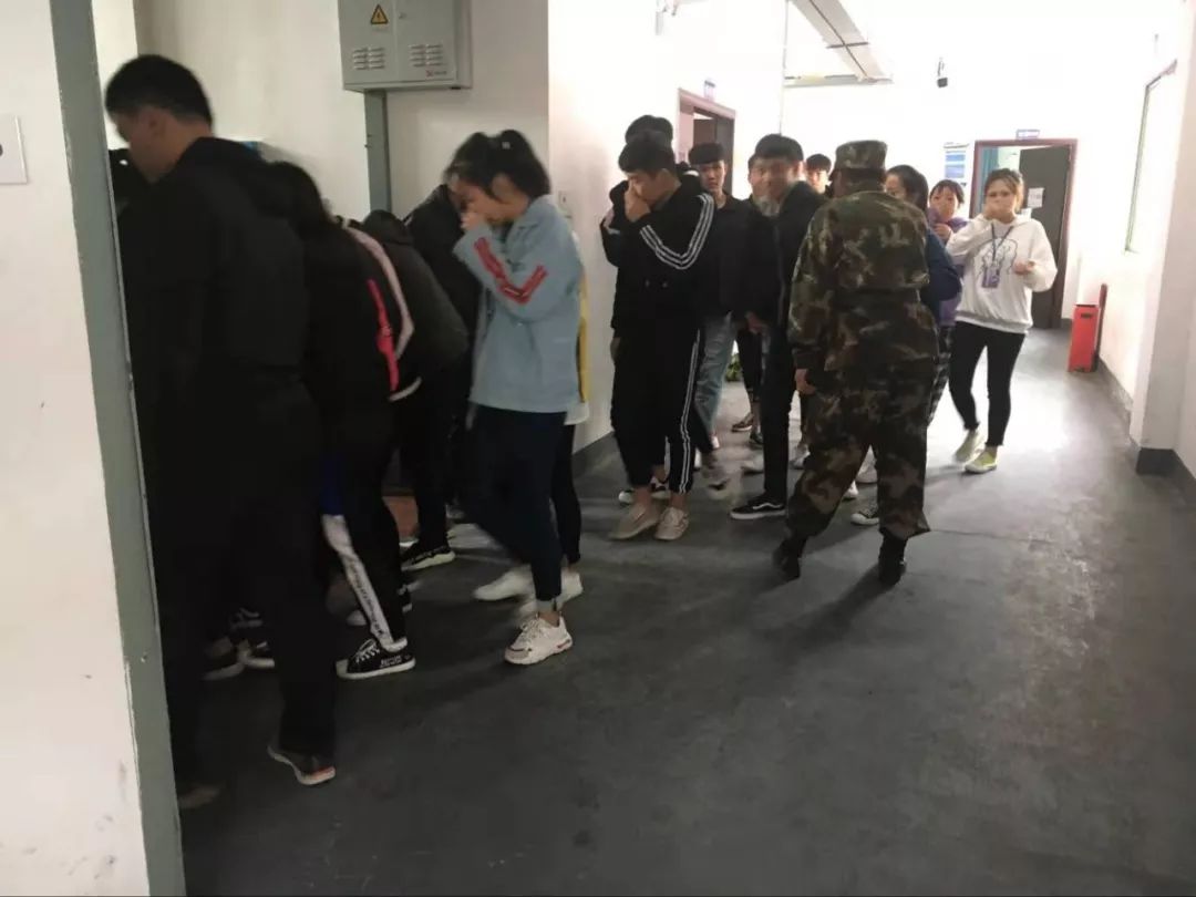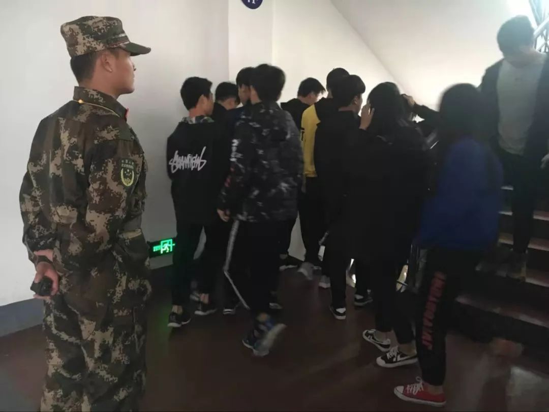 15:50总指挥陈教官集合队伍完毕,并进行报告。学工科副科长陈博宣布“2018年消防应急疏散演练”活动开始,随着急促的警铃声响起,在教室内的学生迅速以身边的衣物或者手帕等,捂住口鼻,猫腰、低姿,沿着疏散楼梯有序撤离。